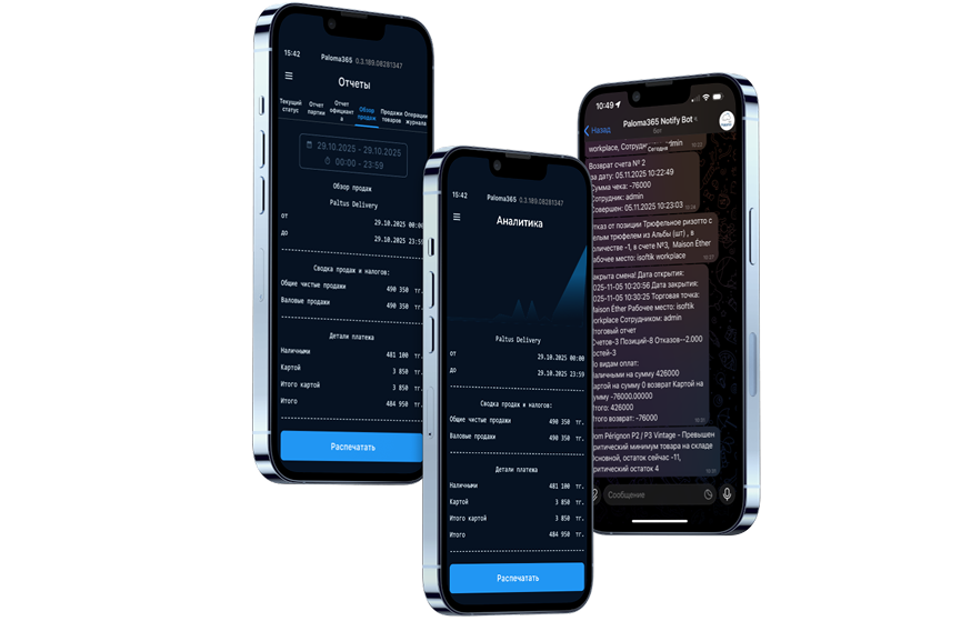 Paloma365 — bu kross-platforma tizimi. Savdoni planshetda boshlab, smartfonda yakunlashingiz mumkin. Barcha ma'lumotlar bir zumda sinxronlanadi.