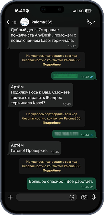 Sizning biznesingiz to'xtamaydi — biz ham. Paloma365 texnik qo'llab-quvvatlashi har kuni soat 08:00 dan 01:00 gacha ishlaydi, shunda siz asosiy ishlaringizga e'tibor qaratishingiz mumkin.